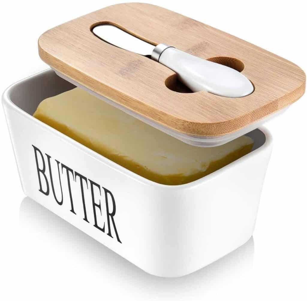 The AISBUGUR ceramic butter dish has a durable lid that keeps water and debris out of the butter, so it will stay fresher longer.