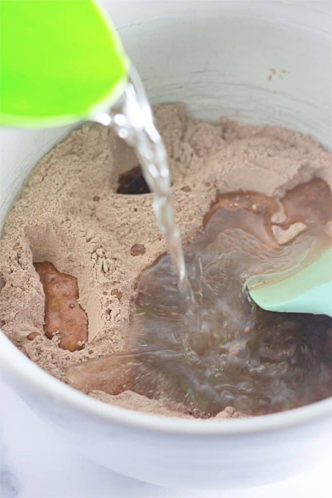 Step 5: Pour the water into the mixing bowl and immediately stir to combine all of the ingredients together.