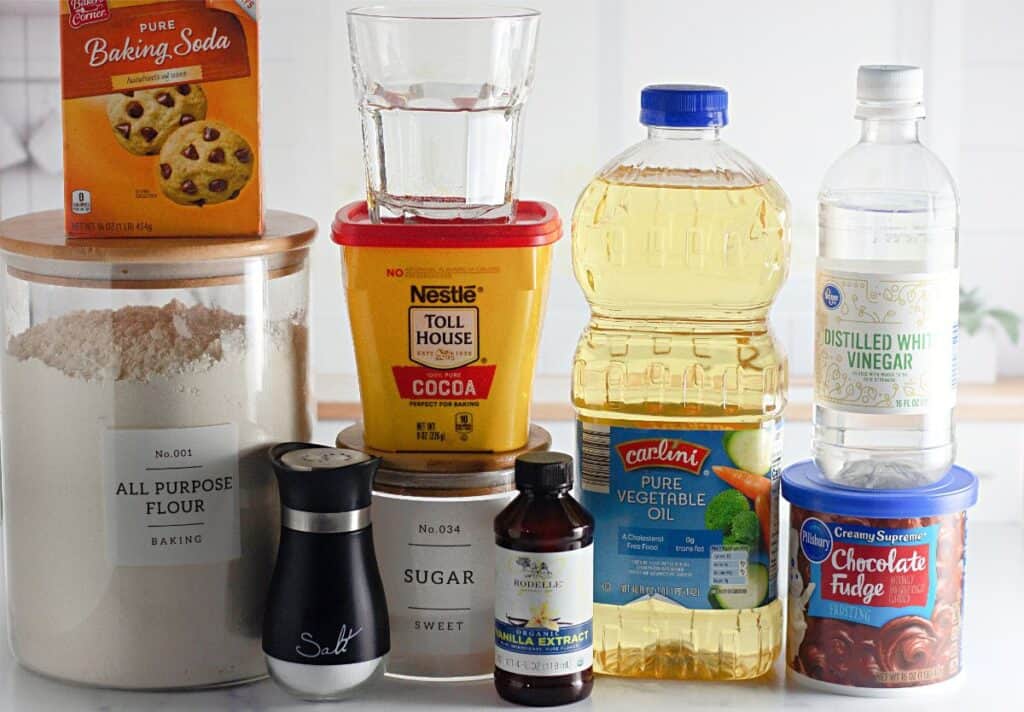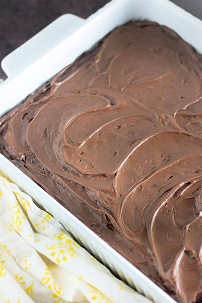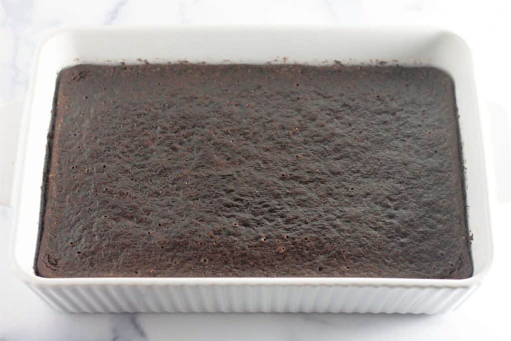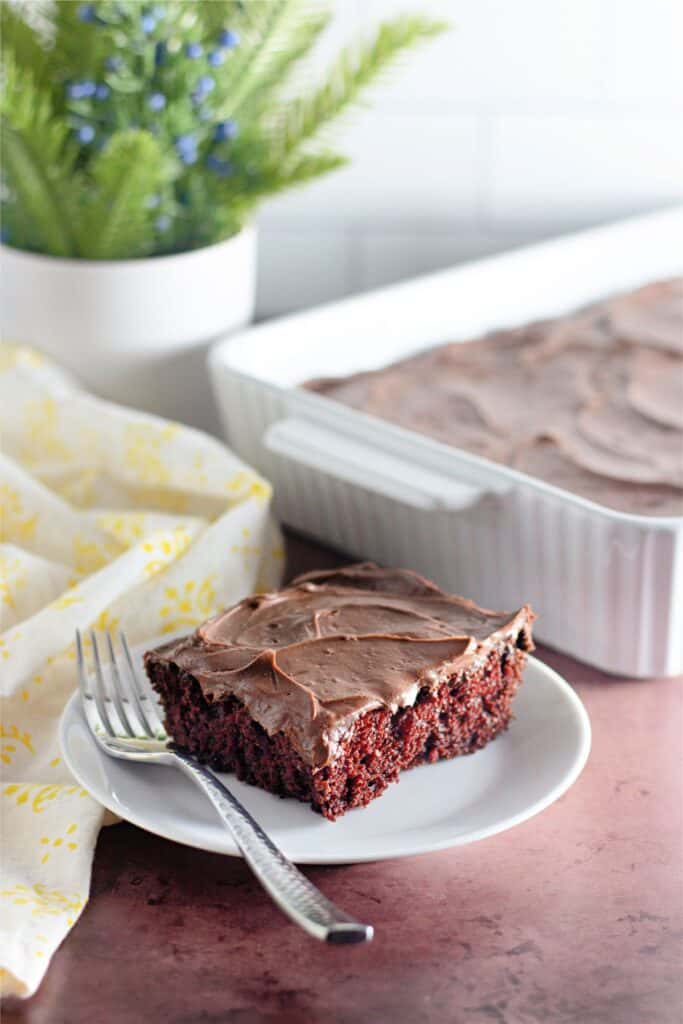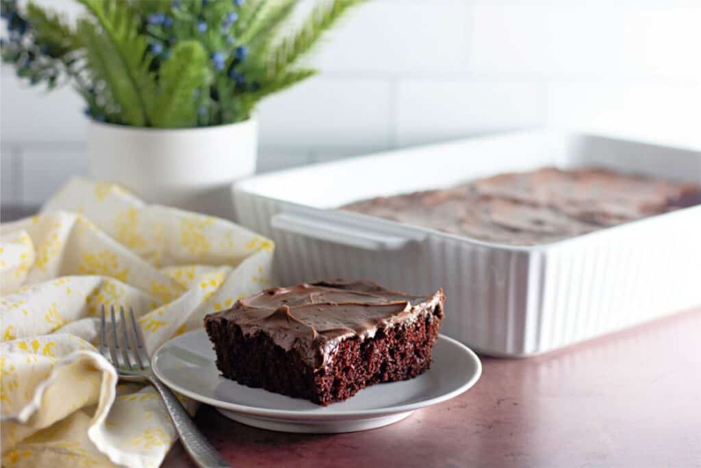 It takes no time to whip up this homemade chocolate cake because it’s made with pantry staples and doesn’t contain any milk, eggs, or butter.