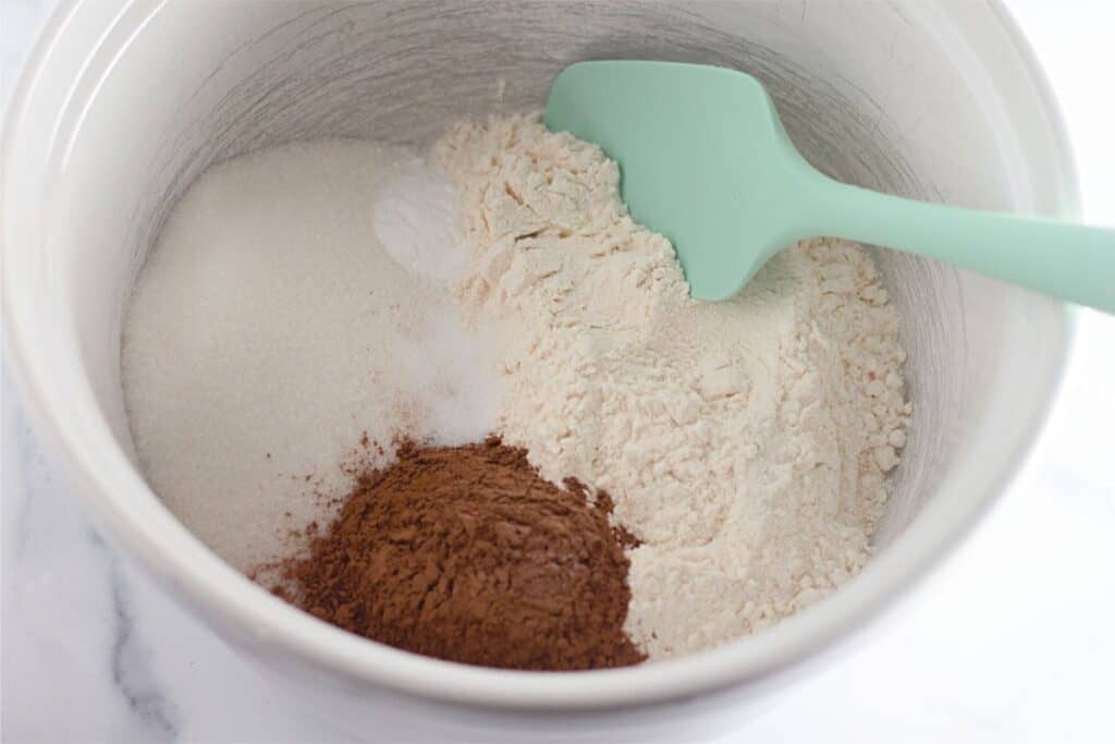 - In a large mixing bowl, whisk together the flour, sugar, cocoa powder, baking soda, and salt.
