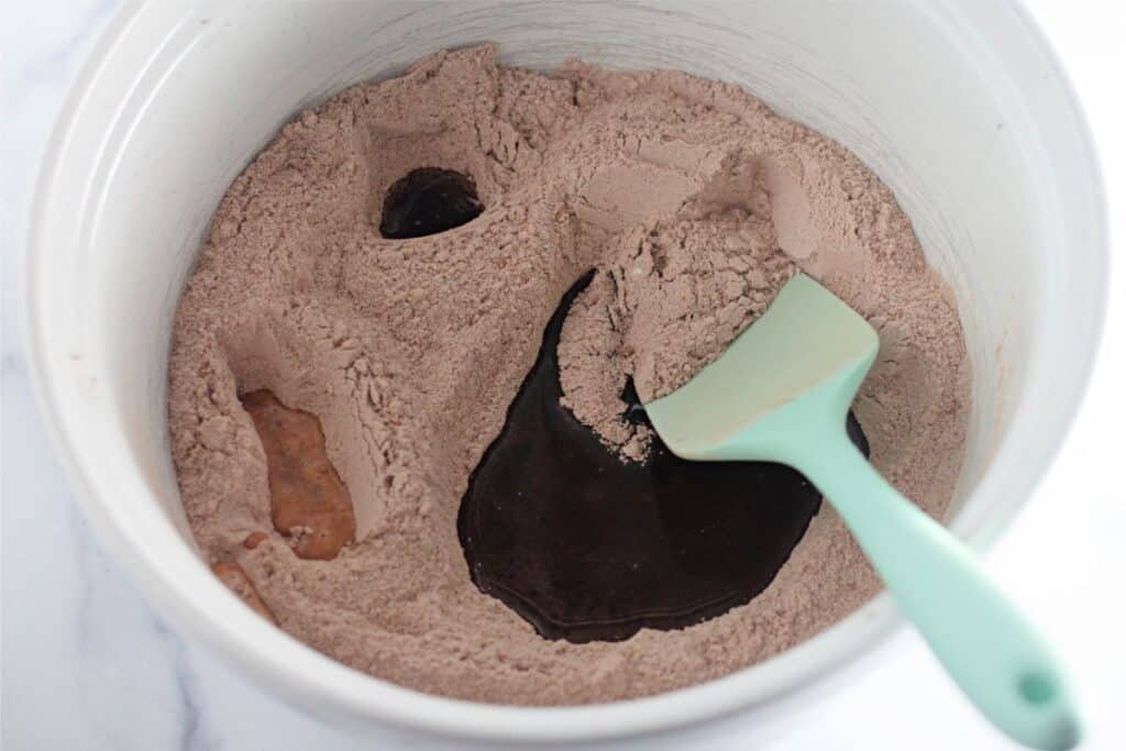 - Pour the water into the mixing bowl and immediately stir to combine all of the ingredients together.