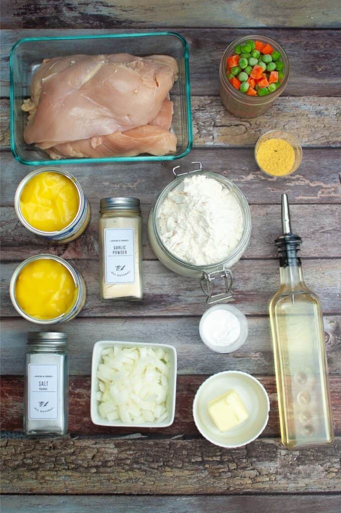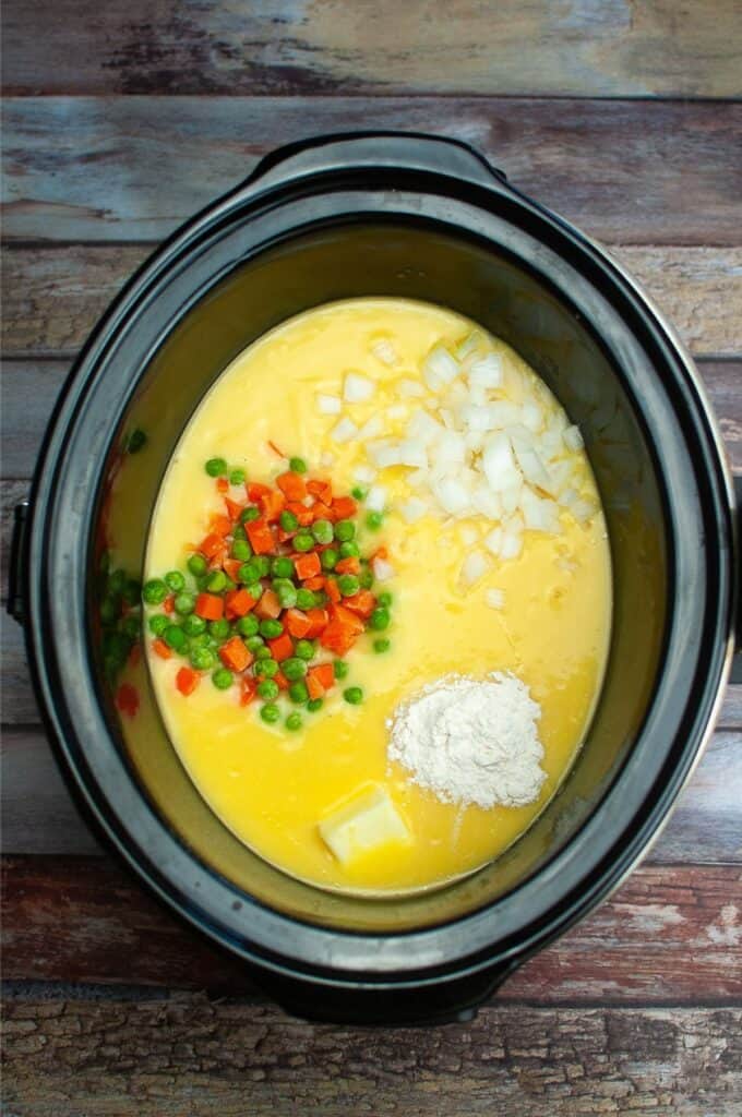 - Add the soup mixture, 1/4 cup flour, onions, peas and carrots on top of the chicken.