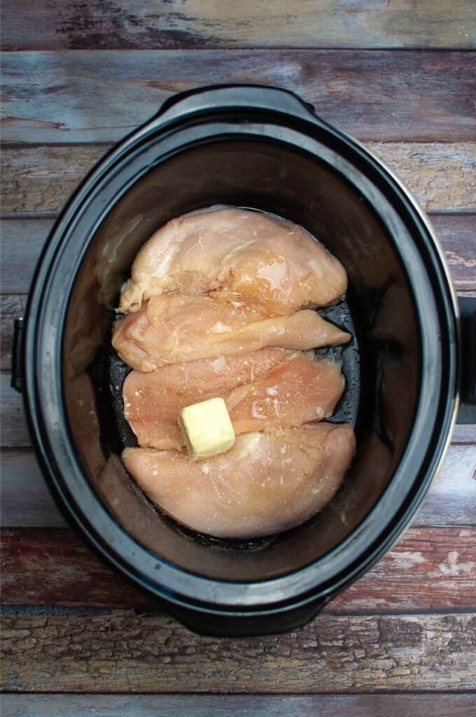 - Add the oil, chicken and 1 tablespoon of butter to the slow cooker.