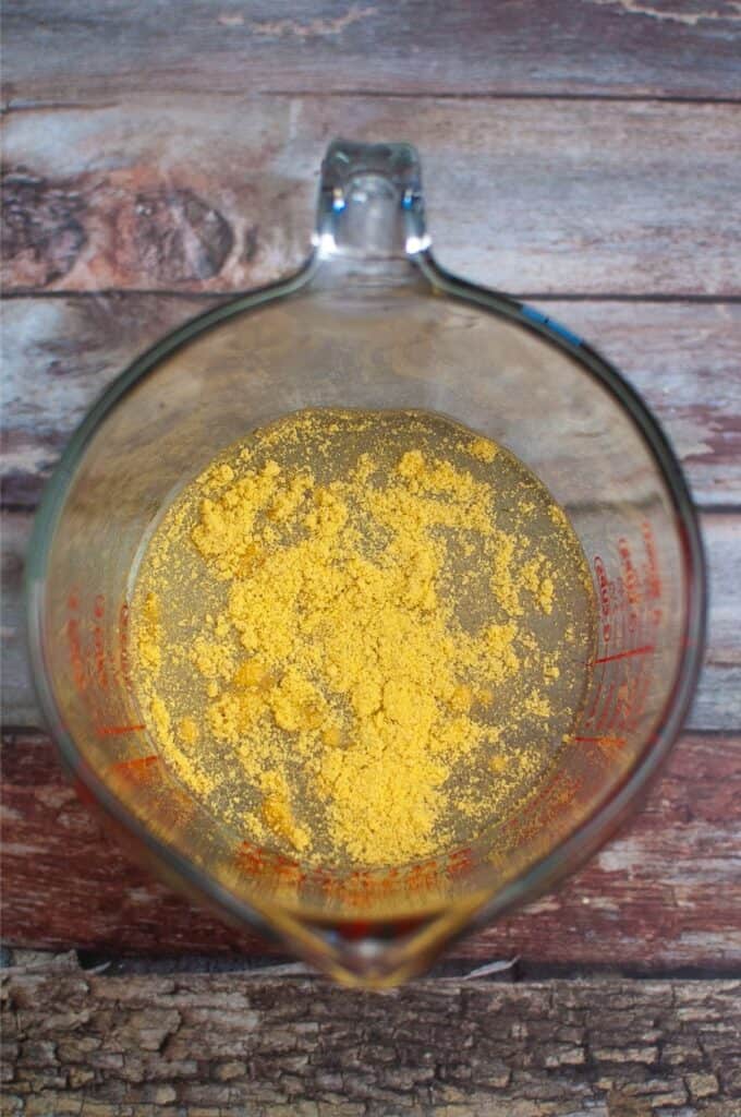 Step 1: Start by adding water to a bowl. Mix in the poultry seasoning and cans of soup. Mix well, then set to the side.