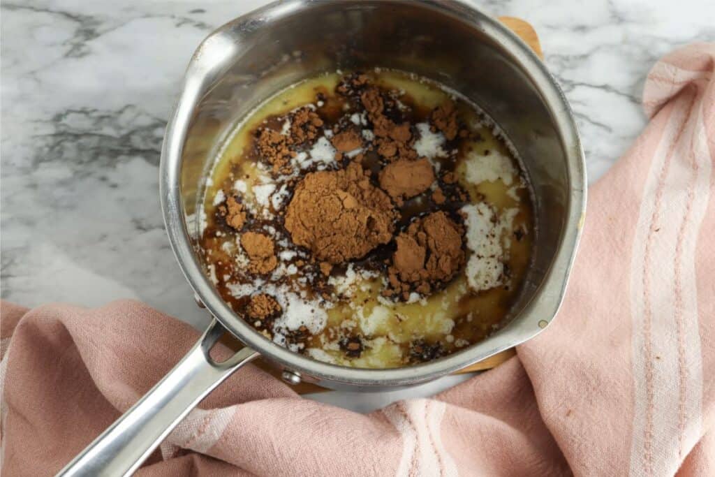 - Heat the butter in a small saucepan over medium heat. When the butter is melted, add the water and unsweetened cocoa powder. Wisk to combine.