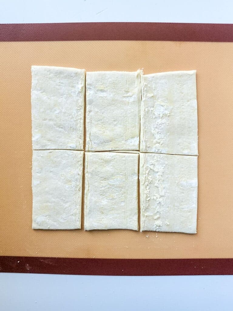 - Lay out the first sheet of puff pastry on a clean surface. Cut into 6 even pieces, following the trifold line already existing in the dough.