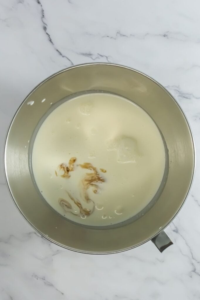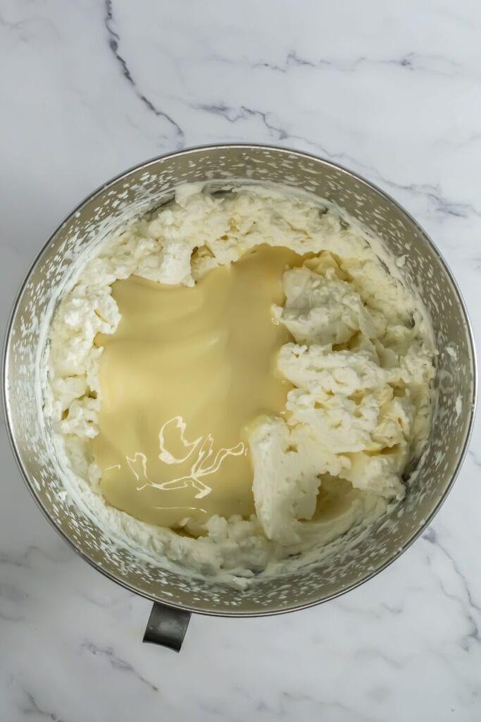 Step 5: Once stiff peaks form, mix in the condensed milk on low.