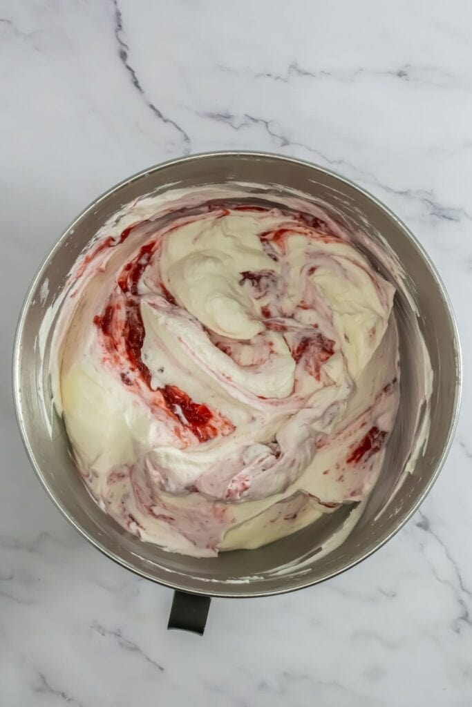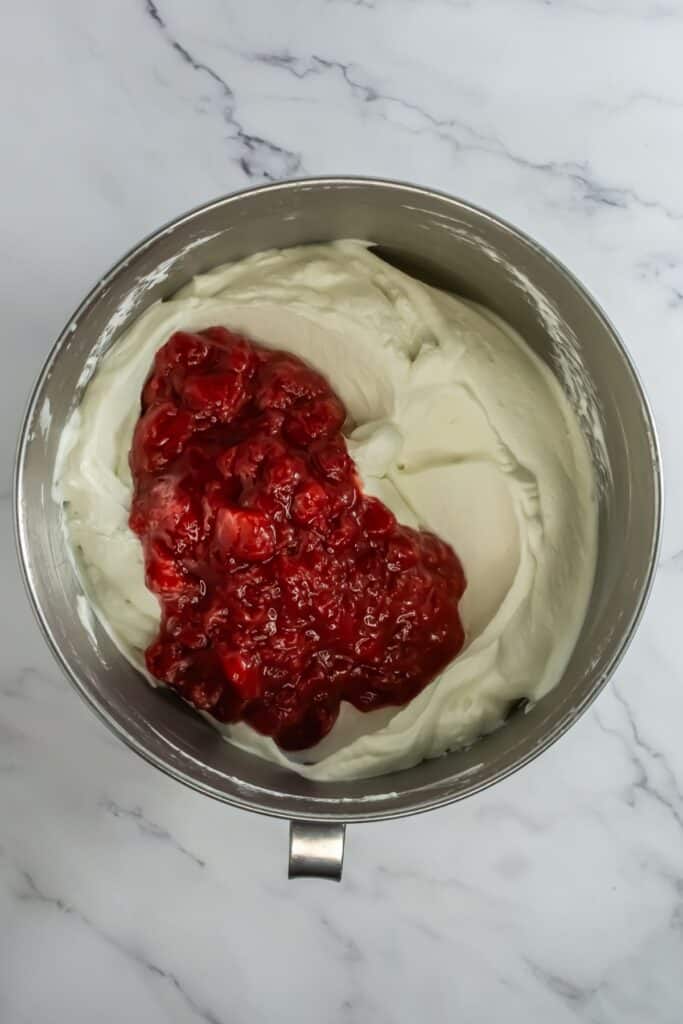 - Add in the strawberry compote and fold just until combined. Do not overstir as it will begin to deflate.