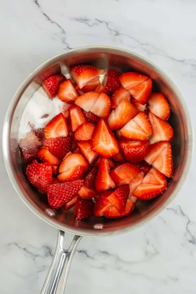 - To make the strawberry compote – in a large sauce pan, combine the strawberries, sugar and lemon juice.