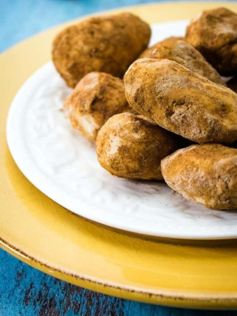 This potato candy is coated in cinnamon. It has a sweet and creamy center, that is made up of cream cheese and coconut.