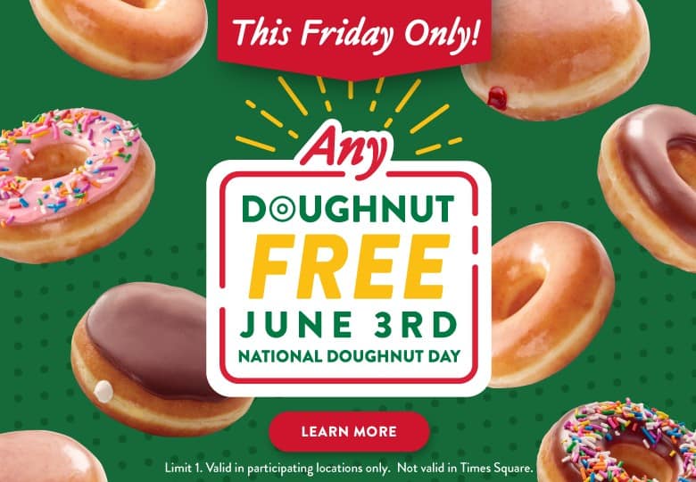 That’s right! You can stop in any Krispy Kreme location and pick up your choice of doughnut FREE!