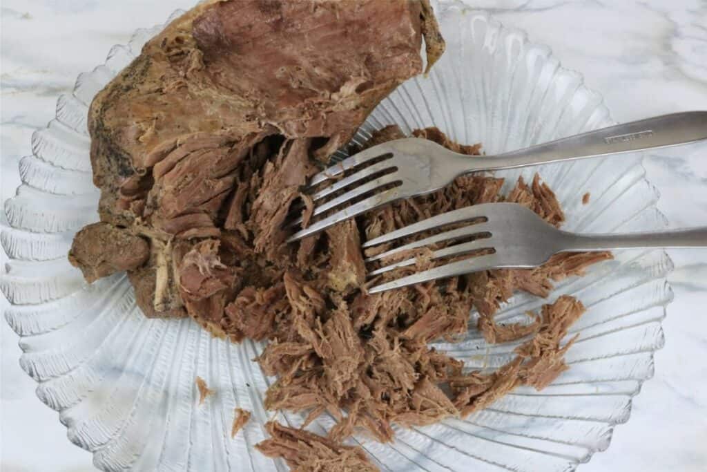 - Remove the roast and place it on a plate. Using two forks, pull apart the roast. It should be super soft and easy to shread/pull apart.