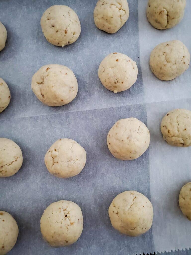 - Shape dough into 1 inch balls and place about 1 inch apart on a cookie sheet lined with parchment paper.