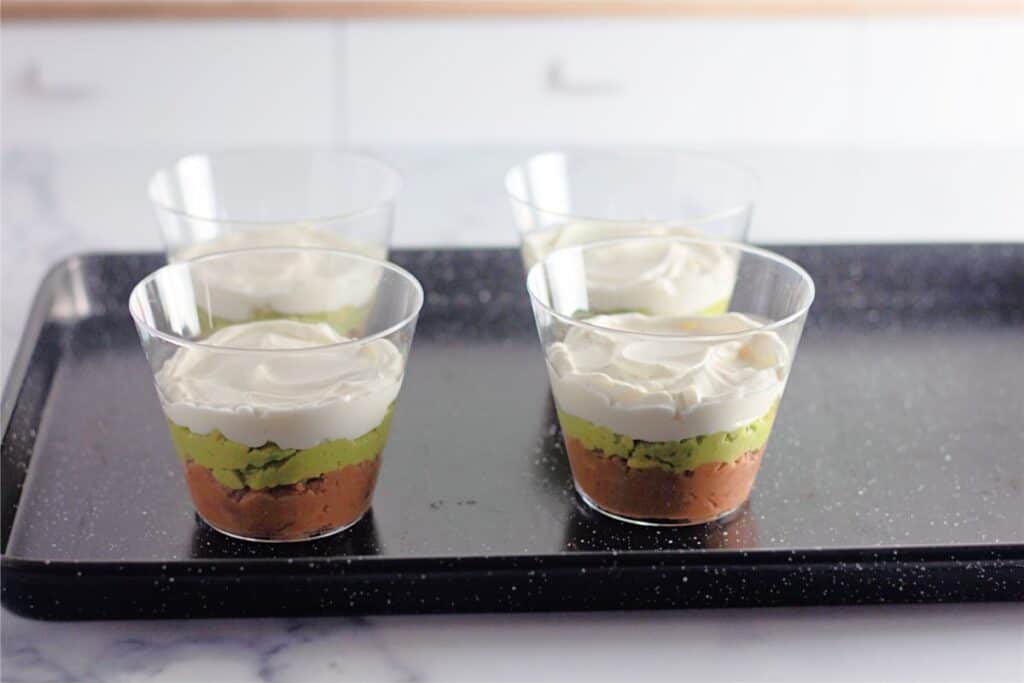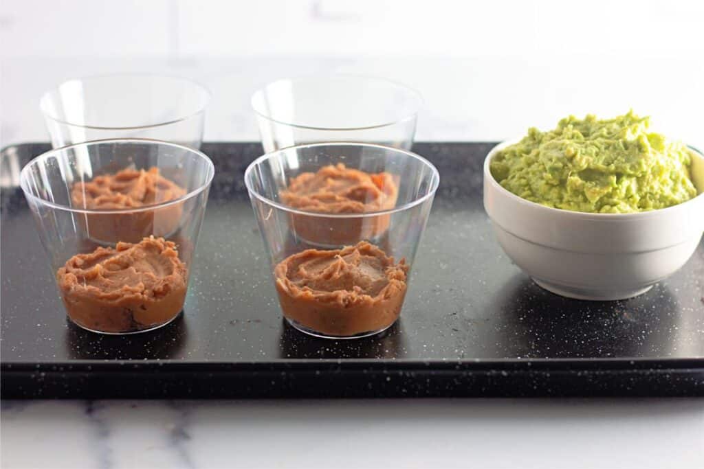 - Spoon 2 tablespoons of refried beans into the bottom of each cup and smooth out with a spoon.