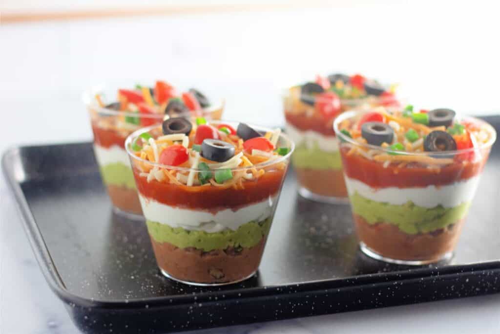 - Clear plastic cups are best so you can showcase the layers of the dip! It will allow you to create that beautiful presentation value.