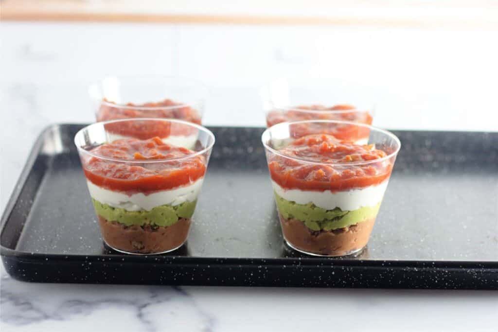 - Spoon 2 tablespoons of salsa over the sour cream layer.