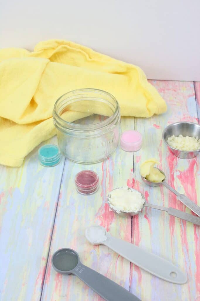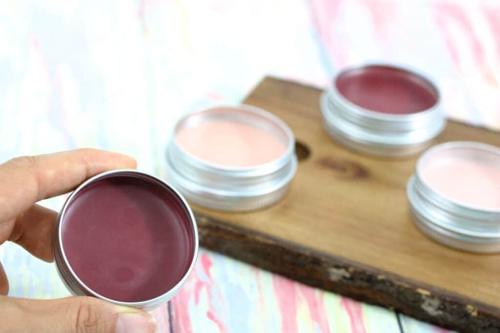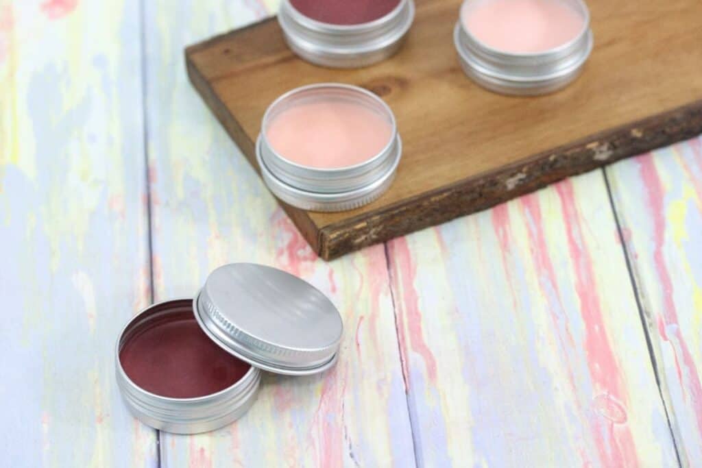 This recipe makes enough tinted lip balm to fill 4 larger lip balm containers.